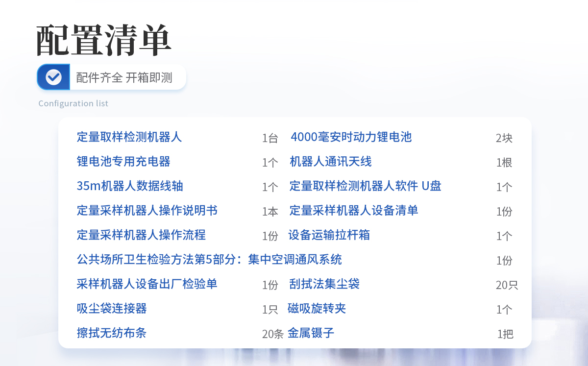 定量取樣檢測(cè)機(jī)器人:1臺(tái) 4000毫安時(shí)動(dòng)力鋰電池:2塊 鋰電池專(zhuān)用充電器:1個(gè) 機(jī)器人通訊天線:1根 35m機(jī)器人數(shù)據(jù)線軸:1個(gè) 定量取樣檢測(cè)機(jī)器人軟件 U盤(pán):1個(gè) 定量采樣機(jī)器人操作說(shuō)明書(shū):1本 定量采樣機(jī)器人設(shè)備清單:1份 定量采樣機(jī)器人操作流程:1份 公共場(chǎng)所衛(wèi)生檢驗(yàn)方法第5部分:集中空調(diào)通風(fēng)系統(tǒng):1份 采樣機(jī)器人設(shè)備出廠檢驗(yàn)單:1份 刮拭法集塵袋 :20只 吸塵袋連接器 :1只 磁吸旋轉(zhuǎn)夾:1個(gè) 擦拭無(wú)紡布條 :20條 金屬鑷子:1把 設(shè)備運(yùn)輸拉桿箱:1個(gè)