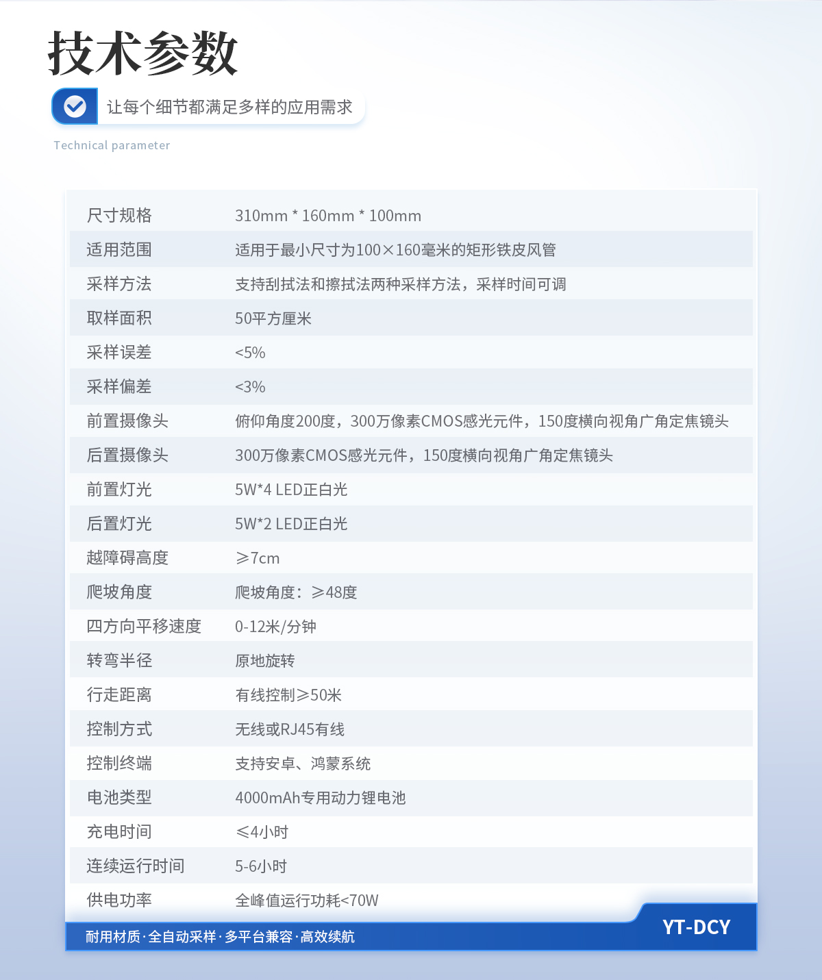 合規(guī)性:完全符合《WS 10013-2023》、《WS/T 10004-2023》及《GB 37488-2019》中對(duì)集中空調(diào)定量采樣機(jī)器人的要求。 緊湊設(shè)計(jì):尺寸長(zhǎng)寬高310mm * 160mm * 100mm,可進(jìn)入*小尺寸為100×160毫米的矩形鐵皮風(fēng)管內(nèi)部進(jìn)行采樣。 精準(zhǔn)采樣:提供刮拭法和擦拭法兩種采樣方法,采樣器取樣面積50平方厘米,密閉雙采樣器加裝氣流回風(fēng)道,并使用光固化3D打印技術(shù)制造,保障了采樣面積的有效性。布條和擁有專(zhuān)利設(shè)計(jì)的刮板夾安裝方便快捷,現(xiàn)場(chǎng)操作時(shí)可**限度地杜絕二次污染,實(shí)現(xiàn)無(wú)菌操作。采樣誤差小于5%,采樣偏差小于3%。 全方位視野:前置攝像頭俯仰角度達(dá)200度,前后均采用150度廣角定焦攝像頭,提供無(wú)死角視野。 靈活控制:支持無(wú)線與有線兩種控制方式,有線控制距離≥50米,無(wú)線控制無(wú)距離限制。視頻采集、拍照及機(jī)器人控制均由終端完成。 強(qiáng)大越障能力:越障礙高度≥7cm,爬坡角度≥48度,整機(jī)含電池工作重量?jī)H為4.0KG。 全自動(dòng)采樣:軟件控制加入了《集塵量采樣》與《微生物采樣》的全自動(dòng)一鍵采樣功能,無(wú)需人工干預(yù)即可完成所有采樣動(dòng)作。 耐用材質(zhì):整機(jī)不低于95%的材料使用航空鋁合金,表面經(jīng)過(guò)氧化噴砂處理并增厚鈍化膜,增加表面硬度。機(jī)體行走模塊一體成型,總重不超過(guò)4KG。 多平臺(tái)兼容:支持安卓系統(tǒng)、鴻蒙系統(tǒng)的手機(jī)、平板、電腦進(jìn)行控制操作。 **續(xù)航:配備4000mAh容量的動(dòng)力電池,充電時(shí)間≤4小時(shí),單次充電后可持續(xù)運(yùn)行約5-6小時(shí)。