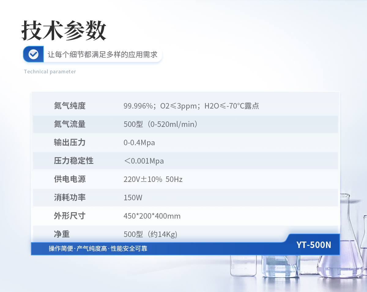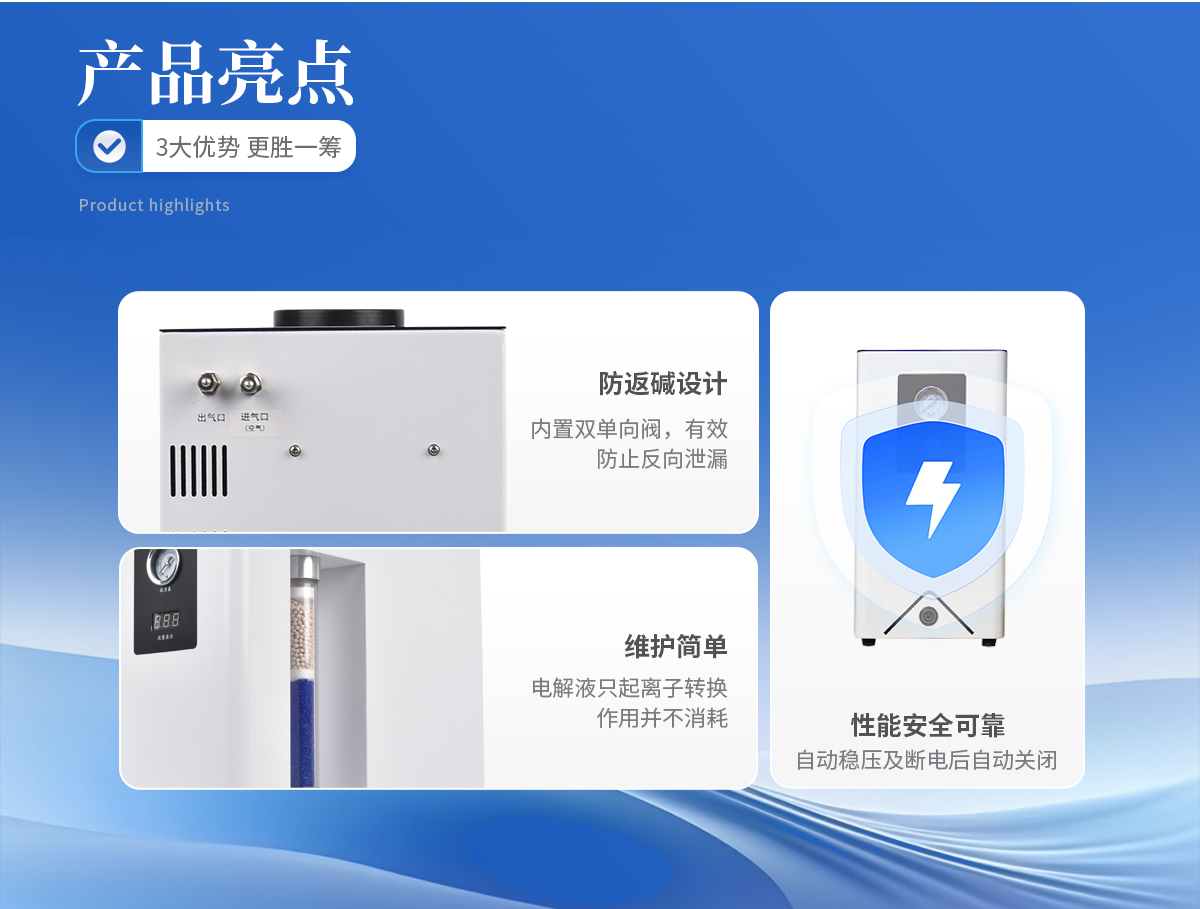 1、可取代高壓氮?dú)馄?,使實驗室儀器化。 2、操作簡便,只需啟動電源開關(guān),儀器即可產(chǎn)氮且輸出壓力穩(wěn)定。 3、不消耗電解液;電解液只起離子轉(zhuǎn)換作用并不消耗,所以只需補(bǔ)充因蒸發(fā)而損失的少量蒸餾水。 4、產(chǎn)氣純度高,空氣經(jīng)電解池分離后即可得到高純氮?dú)狻? 5、性能安全可靠:具有穩(wěn)壓和斷電后自動關(guān)閉氣路功能。 6、壽命長,既可間斷使用,又可連續(xù)使用且產(chǎn)氣量穩(wěn)定、不衰減。 7、**節(jié)能:采用**的開關(guān)電源,提高了電解效率。 8、配有雙單向閥,自動防返堿。