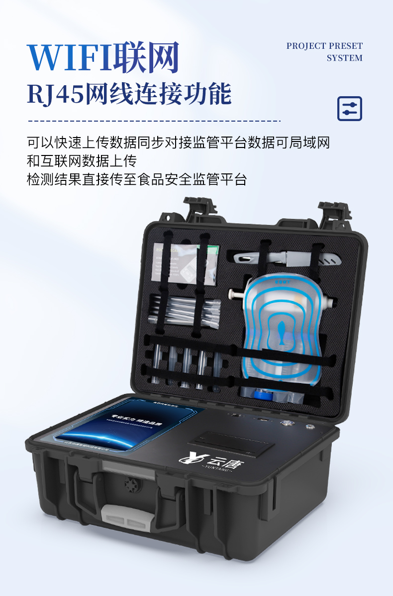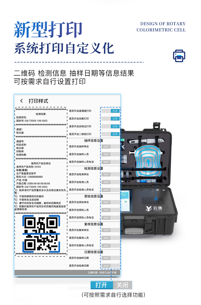 7、圖像調(diào)整功能:可根據(jù)金標卡讀取圖像進行多方位調(diào)整,使其更精準讀取結果。 | 8、儀器檢測系統(tǒng)擁有龐大數(shù)據(jù)庫,并且構建了完善的檢索、修訂功能。食品庫涵蓋多種樣品名稱,可按需添加或刪除、編輯樣品名稱;產(chǎn)品數(shù)據(jù)庫以及歷史檢測記錄支持一鍵檢索功能。 | 9、系統(tǒng)打印自定義化,打印格式多樣化,產(chǎn)品合格證(國家標準要求),二維碼,抽樣信息、檢測信息,受檢信息、復核信息、抽樣日期、檢測日期等信息結果,可按需求自行設置打印內(nèi)容。 | 10、A4紙版本報告打印功能:設備擁有兩種結果展示方式,可以自動生成A4打印模板和小票打印模板兩種樣式,可通過WiFi及網(wǎng)線等方式鏈接外置打印機可進行打印 | 11、儀器具有 wifi 聯(lián)網(wǎng)上傳、RJ45網(wǎng)線連接功能,可以快速上傳數(shù)據(jù)。同步對接監(jiān)管平臺,數(shù)據(jù)可局域網(wǎng)和互聯(lián)網(wǎng)數(shù)據(jù)上傳,檢測結果直接傳至食品安全監(jiān)管平臺。進行區(qū)域食品安全監(jiān)管及大數(shù)據(jù)分析處理與數(shù)據(jù)統(tǒng)計,檢測區(qū)域食品安全長短期動態(tài),達到食品安全問題預估、預警。 | 12、設備支持U盤存儲,標準USB接口,免驅(qū)動安裝。檢測結果存儲容量20萬條以上,可生成Excel表格,進行一鍵拷貝,并具有登錄保護功能,可設置用戶名及密碼,規(guī)范不同人員操作權限,防止非工作人員操作,并且可以進行重新校準、鎖定、恢復出廠設置功能。儀器固件可升級,后期檢測項目可擴充。 | 13、儀器具備遠程升級功能,可定向分客戶分儀器更新,開機后自動更新,并可持續(xù)性免費更新系統(tǒng)版本,無需像傳統(tǒng)產(chǎn)品返廠更新,節(jié)省時間及人力成本并避免了物流運輸返廠升級導致設備損壞的潛在風險。 |