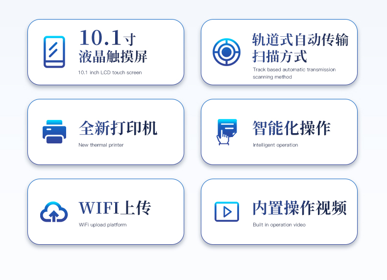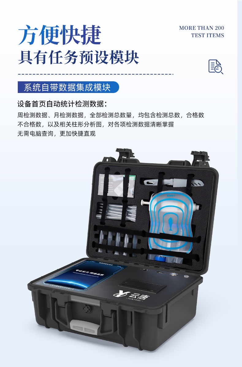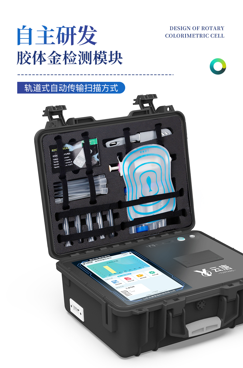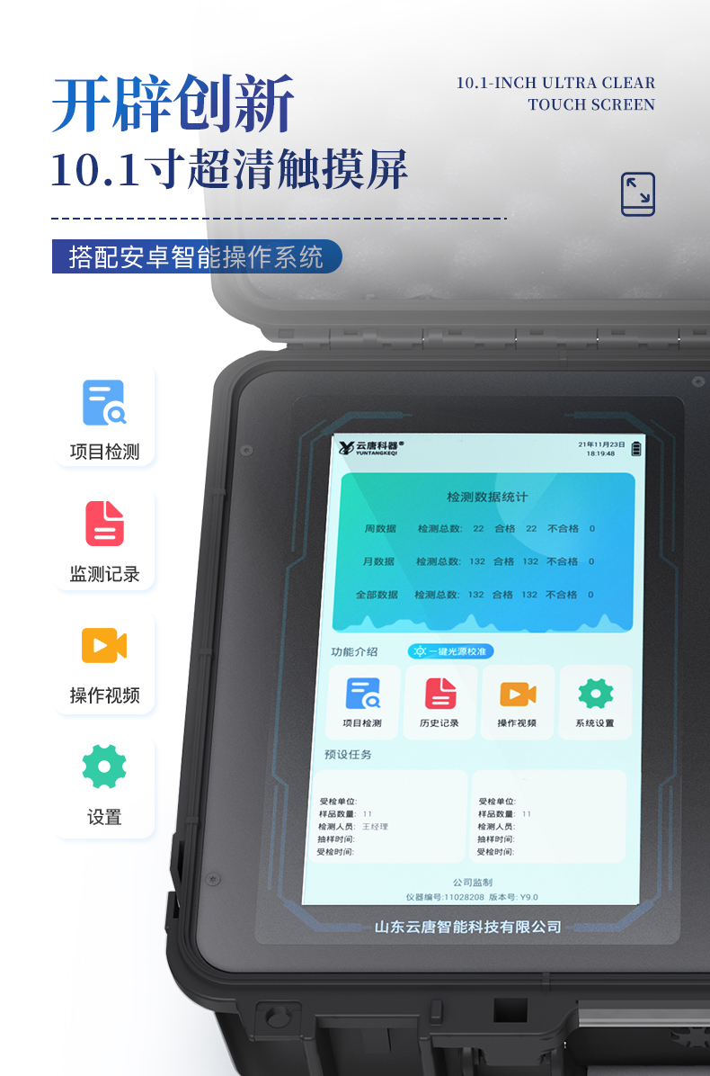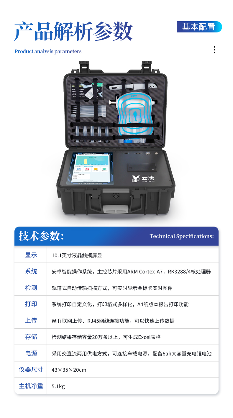 | 1、儀器采用10.1英寸液晶觸摸屏顯,搭配運行安卓智能操作系統(tǒng),主控芯片采用ARM Cortex-A7,RK3288/4核處理器,主頻1.88Ghz,運轉(zhuǎn)速度更快速,性能更強。 | 2、儀器功能包括:膠體金檢測模塊、數(shù)字化管理模塊、無線通訊模塊等,可以滿足同一軟件下實現(xiàn)所有檢測項目的檢測,并在同一窗口展示檢測結果。 | 3、一體化便攜式快檢設備,采用交直流兩用供電方式,可連接車載電源,配備6ah大容量充電鋰電池,可以滿足現(xiàn)場及流動檢測使用的需求。儀器尺寸:43×35×20cm, 主機凈重:5.1kg | 4、系統(tǒng)自帶數(shù)據(jù)集成模塊,設備首頁自動統(tǒng)計檢測數(shù)據(jù)包含:周檢測數(shù)據(jù)、月檢測數(shù)據(jù),全部檢測總數(shù)量,均包含檢測總數(shù),合格數(shù),不合格數(shù),以及相關柱形分析圖,對各項檢測數(shù)據(jù)清晰掌握,無需電腦查詢,更加快捷直觀。 | 5、儀器具有任務預設模塊,可在樣品送檢前提前預設樣品名稱、檢測指標、送檢單位等信息,樣品送檢時一鍵調(diào)取保存信息,檢測更加方便快捷。 |