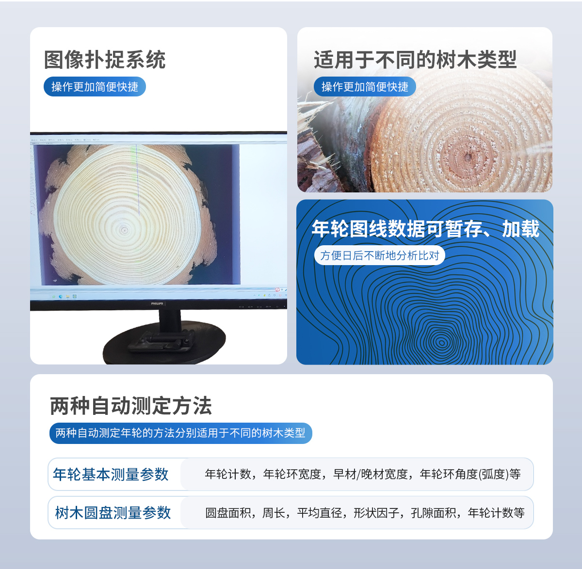 年輪圖像分析系統(tǒng)是一款多平臺圖象分析系統(tǒng),與掃描儀匹配,專門對盤狀的木材截面或柱狀的生長錐樣本進行樹木年輪的測量。大型木材樣本可在不同部位多次分別成像;特殊的樹芯定位器用以放置柱狀樣本;兩種自動測定年輪的方法分別適用于不同的樹木類型;人工輔助的圖像識別校正和遺漏像素添加功能;此外,可自動設(shè)置裂縫與年輪角度的切線,以保證測量的精準(zhǔn)性;另外,附加功能可進行植物的標(biāo)準(zhǔn)生長分析,如莖干平均半徑、直徑以及總體截面積;樹木高度、體積、樹齡等。對于所分析的年輪圖像可同時顯示如下參數(shù):年輪寬度、早材/夏材寬度、年輪**/*小密度/平均密度、早材/夏材等。