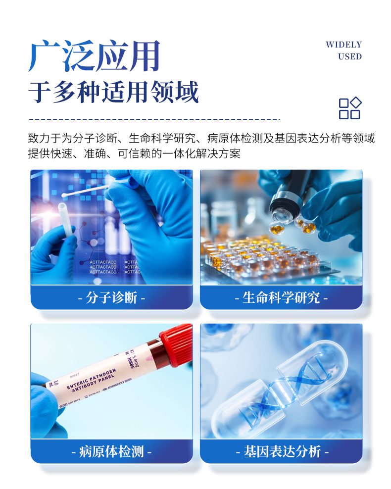 基礎科學研究、病原體檢測、肉制品摻假、轉(zhuǎn)基因檢測、食品安全檢測、藥物開發(fā)及合理用藥、基因表達、水體監(jiān)測、松材線蟲檢測、寵物檢測、養(yǎng)殖業(yè)疫病檢測