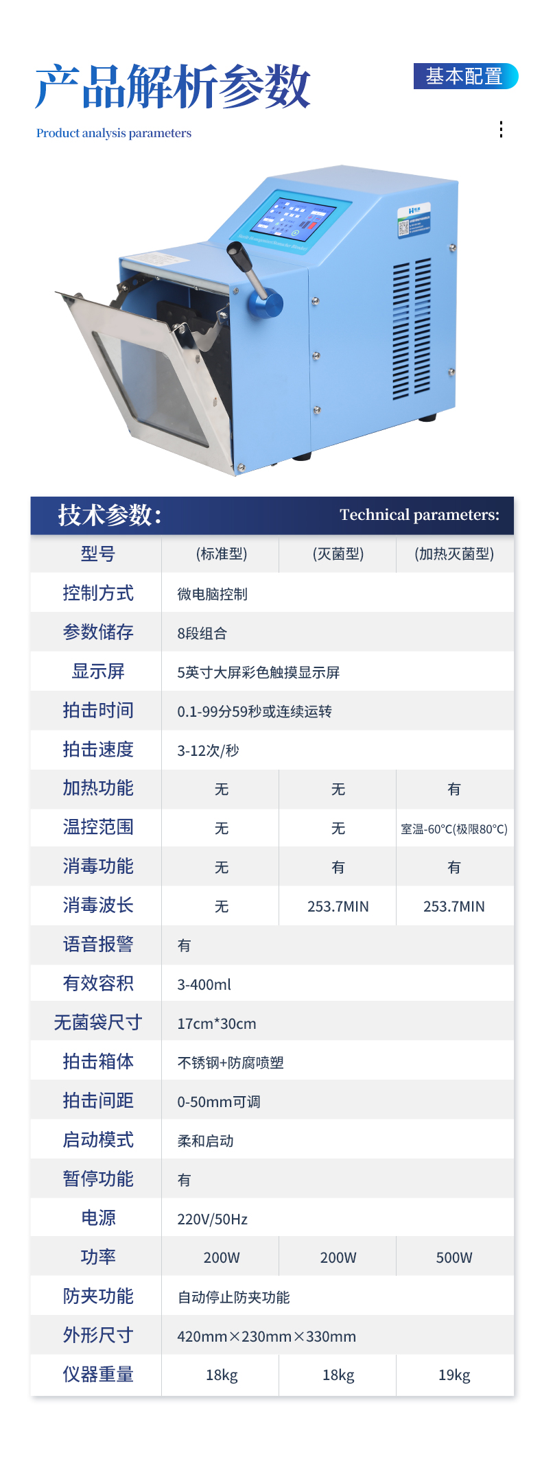 ●5英寸液晶顯示屏。 ●可儲存三組工作程序。 ●可調(diào)整的均質(zhì)時間。 ●均質(zhì)速度可調(diào)節(jié)或固定。 ●拍擊器可調(diào)整前后距離。 ●無菌一次性濾袋,保證衛(wèi)生。 ●全開啟式門,易于清洗。 ●玻璃透明窗口易于觀察 。 ●樣品與均質(zhì)儀無接觸,如無樣品泄露則不需進行系統(tǒng)清洗. ●均質(zhì)柔和、樣品零污染、無損傷、不升溫、不需要滅菌處理,不需洗刷器皿。