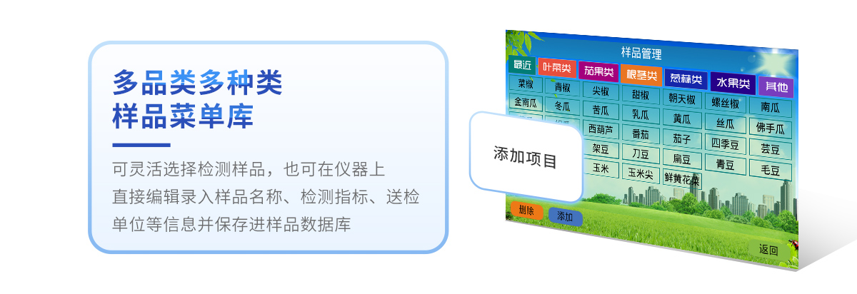 10、儀器具有多品類多種類樣品菜單庫,可靈活選擇檢測樣品,不同的檢測通道可同時檢測不同的樣品項目。也可在儀器上直接編輯錄入樣品名稱、檢測指標、送檢單位等信息并保存進樣品數(shù)據(jù)庫。