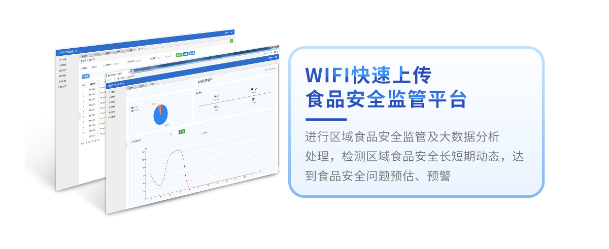8、儀器帶有監(jiān)管平臺。數(shù)據(jù)可局域網(wǎng)和互聯(lián)網(wǎng)數(shù)據(jù)上傳,檢測結(jié)果直接傳至食品安全監(jiān)管平臺。進行區(qū)域食品安全監(jiān)管及大數(shù)據(jù)分析處理,檢測區(qū)域食品安全長短期動態(tài),達到食品安全問題預(yù)估、預(yù)警