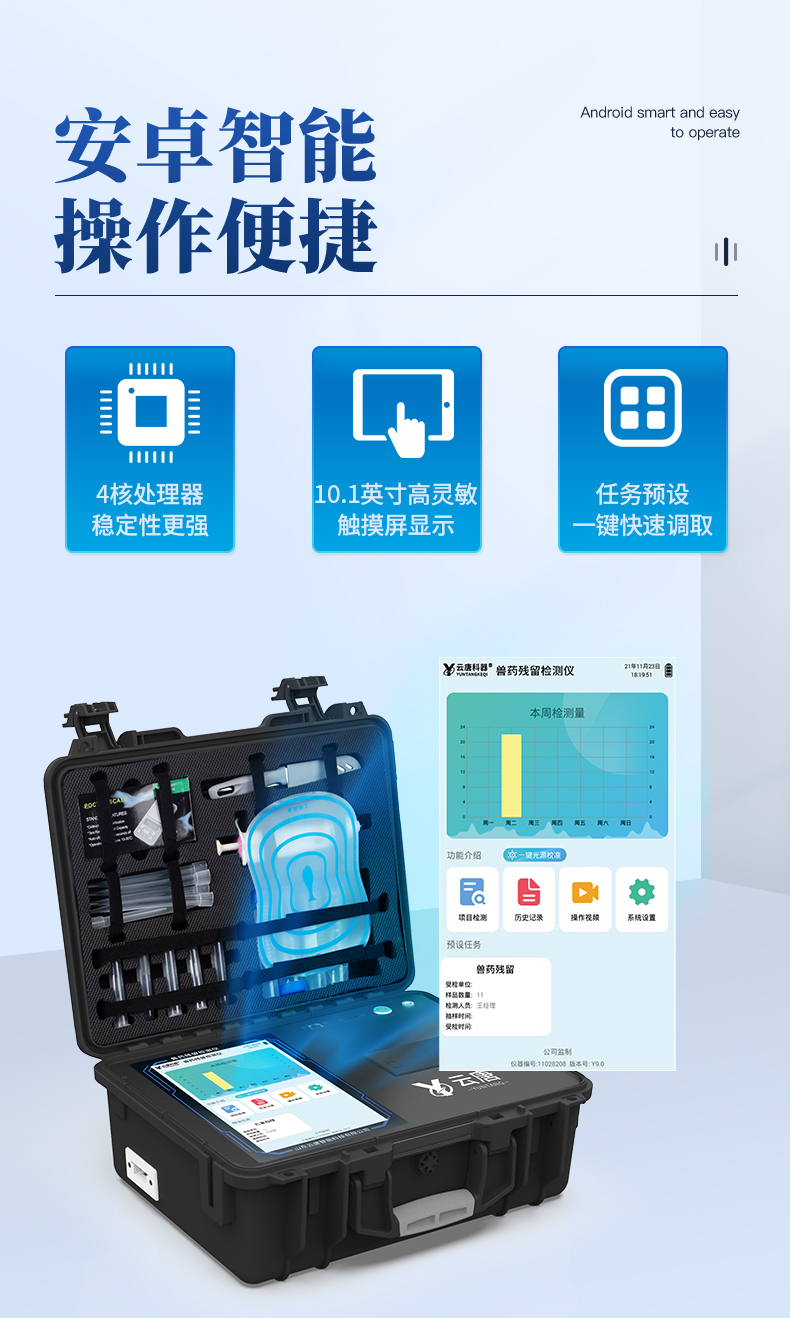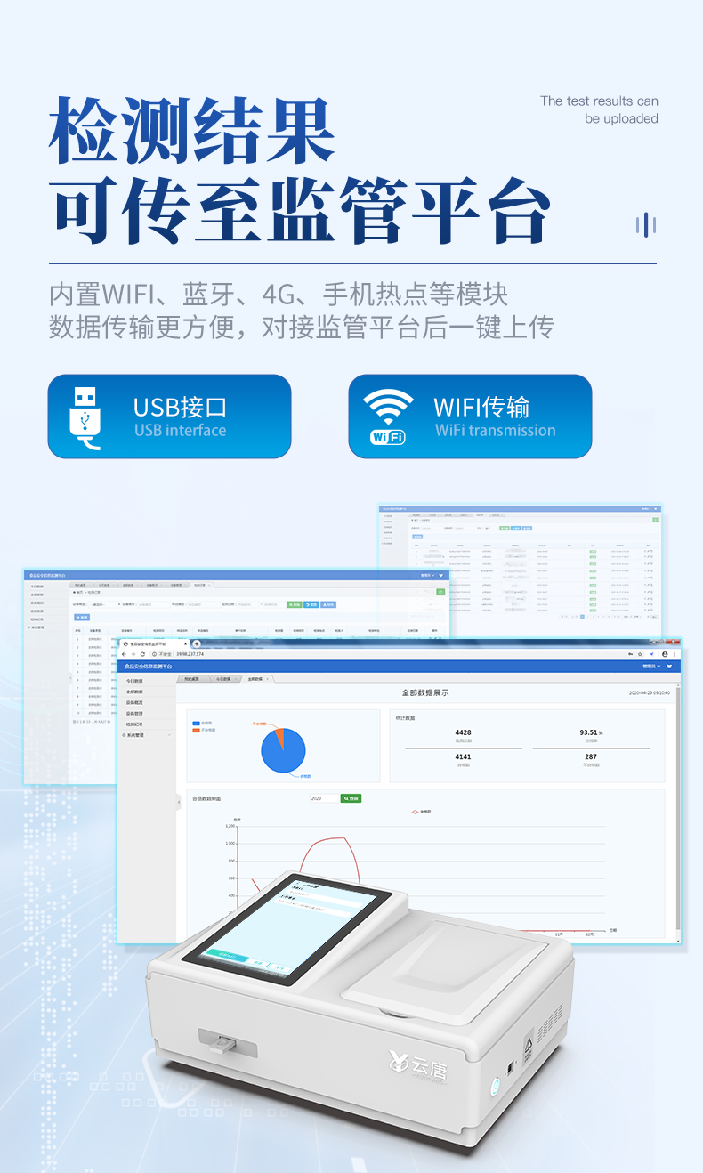 | 儀器采用10.1英寸液晶觸摸屏顯,搭配運行安卓智能操作系統(tǒng),主控芯片采用ARM Cortex-A7,RK3288/4核處理器,主頻1.88Ghz,運轉(zhuǎn)速度更快速,性能更強。 | 儀器功能包括:膠體金檢測模塊、數(shù)字化管理模塊、無線通訊模塊等,可以滿足同一軟件下實現(xiàn)所有檢測項目的檢測,并在同一窗口展示檢測結(jié)果。 | 一體化便攜式快檢設(shè)備,采用交直流兩用供電方式,可連接車載電源,配備6ah大容量充電鋰電池,可以滿足現(xiàn)場及流動檢測使用的需求。儀器尺寸:43×35×20cm, 主機凈重:5.1kg | 系統(tǒng)自帶數(shù)據(jù)集成模塊,設(shè)備首頁自動統(tǒng)計檢測數(shù)據(jù)包含:周檢測數(shù)據(jù)、月檢測數(shù)據(jù),全部檢測總數(shù)量,均包含檢測總數(shù),合格數(shù),不合格數(shù),以及相關(guān)柱形分析圖,對各項檢測數(shù)據(jù)清晰掌握,無需電腦查詢,更加快捷直觀。 | 儀器具有任務(wù)預(yù)設(shè)模塊,可在樣品送檢前提前預(yù)設(shè)樣品名稱、檢測指標、送檢單位等信息,樣品送檢時一鍵調(diào)取保存信息,檢測更加方便快捷。 | 膠體金檢測模塊: 直插式自動掃描方式,可實時顯示金標卡實時圖像,系統(tǒng)自動分析并呈現(xiàn)出CT曲線圖,CT線自動識別,無需手動調(diào)整,完成檢測后自動退出檢測卡。 結(jié)果判定線可修改,對照值標定值可保存,斷電不丟失數(shù)據(jù)。 兼容市場上其他膠體金卡,使用耗材不受限制,極大增強用戶使用體驗。 | 儀器檢測系統(tǒng)擁有龐大數(shù)據(jù)庫,并且構(gòu)建了完善的檢索、修訂功能。食品庫涵蓋多種樣品名稱,可按需添加或刪除、編輯樣品名稱;產(chǎn)品數(shù)據(jù)庫以及歷史檢測記錄支持一鍵檢索功能。 | 系統(tǒng)打印自定義化,打印格式多樣化,產(chǎn)品合格證(國家標準要求),二維碼,抽樣信息、檢測信息,受檢信息、復(fù)核信息、抽樣日期、檢測日期等信息結(jié)果,可按需求自行設(shè)置打印內(nèi)容。 | A4紙版本報告打印功能(可選配):設(shè)備擁有兩種結(jié)果展示方式,可以自動生成A4打印模板和小票打印模板兩種樣式,可通過WiFi及網(wǎng)線等方式鏈接外置打印機可進行打印 | 儀器具有 wifi 聯(lián)網(wǎng)上傳、RJ45網(wǎng)線連接功能,可以快速上傳數(shù)據(jù)。同步對接監(jiān)管平臺,數(shù)據(jù)可局域網(wǎng)和互聯(lián)網(wǎng)數(shù)據(jù)上傳,檢測結(jié)果直接傳至食品安全監(jiān)管平臺。進行區(qū)域食品安全監(jiān)管及大數(shù)據(jù)分析處理與數(shù)據(jù)統(tǒng)計,檢測區(qū)域食品安全長短期動態(tài),達到食品安全問題預(yù)估、預(yù)警。 | 設(shè)備支持U盤存儲,標準USB接口,免驅(qū)動安裝。檢測結(jié)果存儲容量20萬條以上,可生成Excel表格,進行一鍵拷貝,并具有登錄保護功能,可設(shè)置用戶名及密碼,規(guī)范不同人員操作權(quán)限,防止非工作人員操作,并且可以進行重新校準、鎖定、恢復(fù)出廠設(shè)置功能。儀器固件可升級,后期檢測項目可擴充。 | 儀器具備遠程升級功能,可定向分客戶分儀器更新,開機后自動更新,并可持續(xù)性免費更新系統(tǒng)版本,無需像傳統(tǒng)產(chǎn)品返廠更新,節(jié)省時間及人力成本并避免了物流運輸返廠升級導(dǎo)致設(shè)備損壞的潛在風(fēng)險。 |