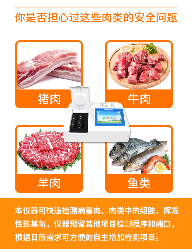 可快速檢測(cè)病害肉、組胺、揮發(fā)性鹽基氮,儀器預(yù)留其他項(xiàng)目檢測(cè)程序和端口,根據(jù)日后需求可方便的自主增加檢測(cè)項(xiàng)目。