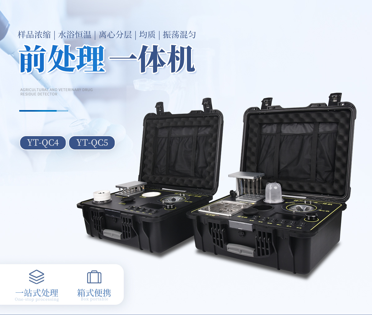 應(yīng)國(guó)內(nèi)用戶的實(shí)際需求,自行研制開發(fā)的新型儀器——QC05型樣品前處理一體機(jī)。樣品前處理集成箱將樣本前處理過程中樣品濃縮、水浴恒溫、離心分層、均質(zhì)、振蕩混勻等步驟所需設(shè)備進(jìn)行集成,僅需一臺(tái)樣品前處理集成箱設(shè)備即可完成所有樣本前處理過程,并且方便攜帶,不僅適用于現(xiàn)場(chǎng)檢測(cè)使用,還可用于色譜、質(zhì)譜等分析樣品的純化和制備。