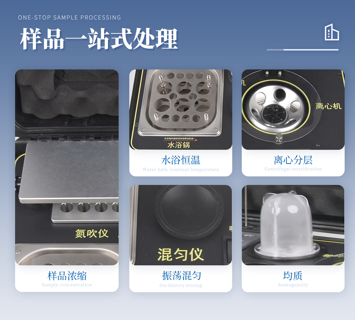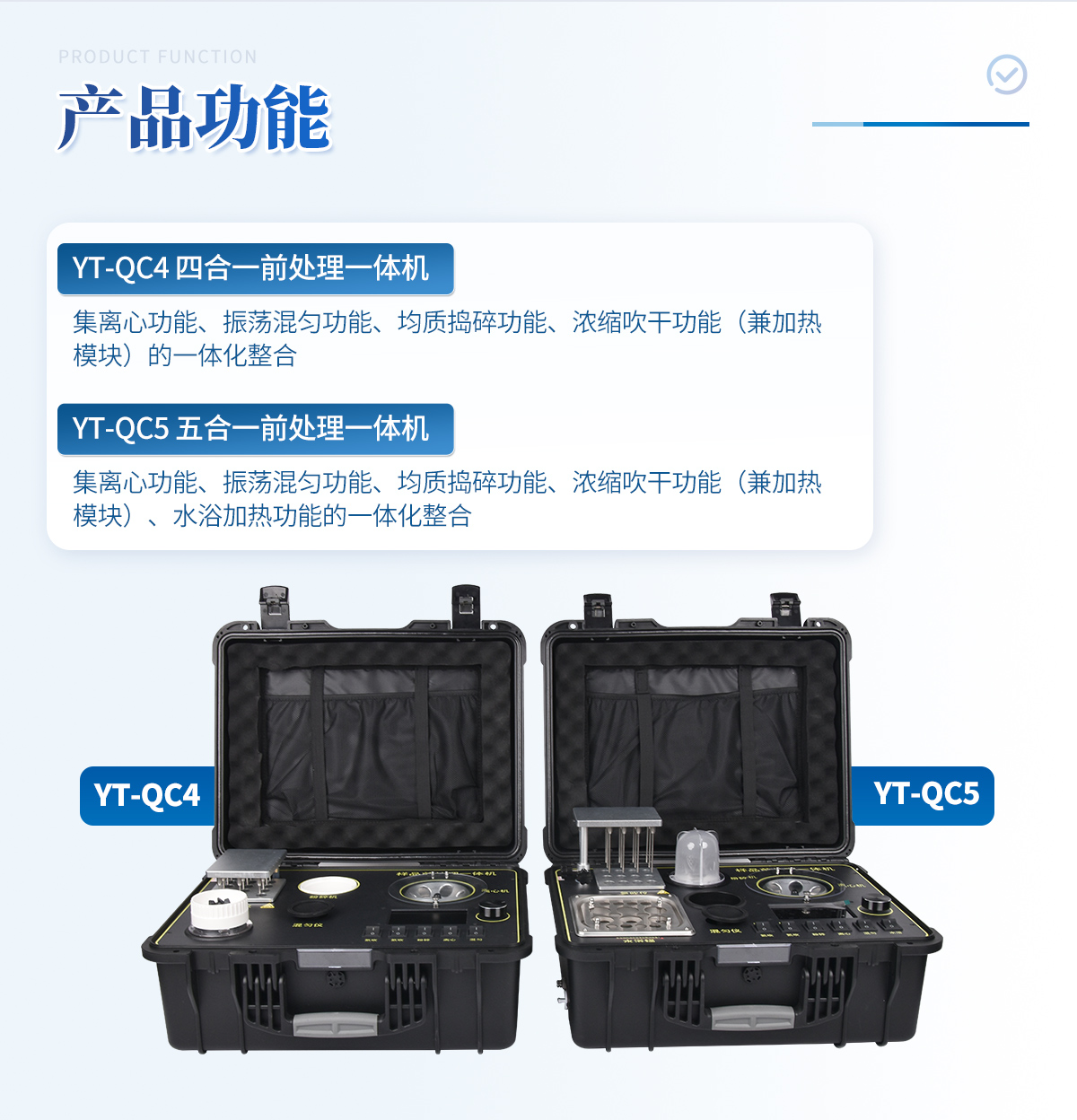 | 1、功能緊湊,集成五種樣品前處理常用的功能,完成樣品一站式處理。 | 2、結(jié)構(gòu)穩(wěn)固,機(jī)箱采用***工程塑料,具備**的抗沖擊性、耐腐蝕性、便攜性。 | 3、操作穩(wěn)定,機(jī)器采用五寸全彩色液晶屏,功能指示性強(qiáng),用戶操作均為實(shí)體開關(guān),杜絕佩戴手套和液體噴濺時(shí)的操作失效。 |