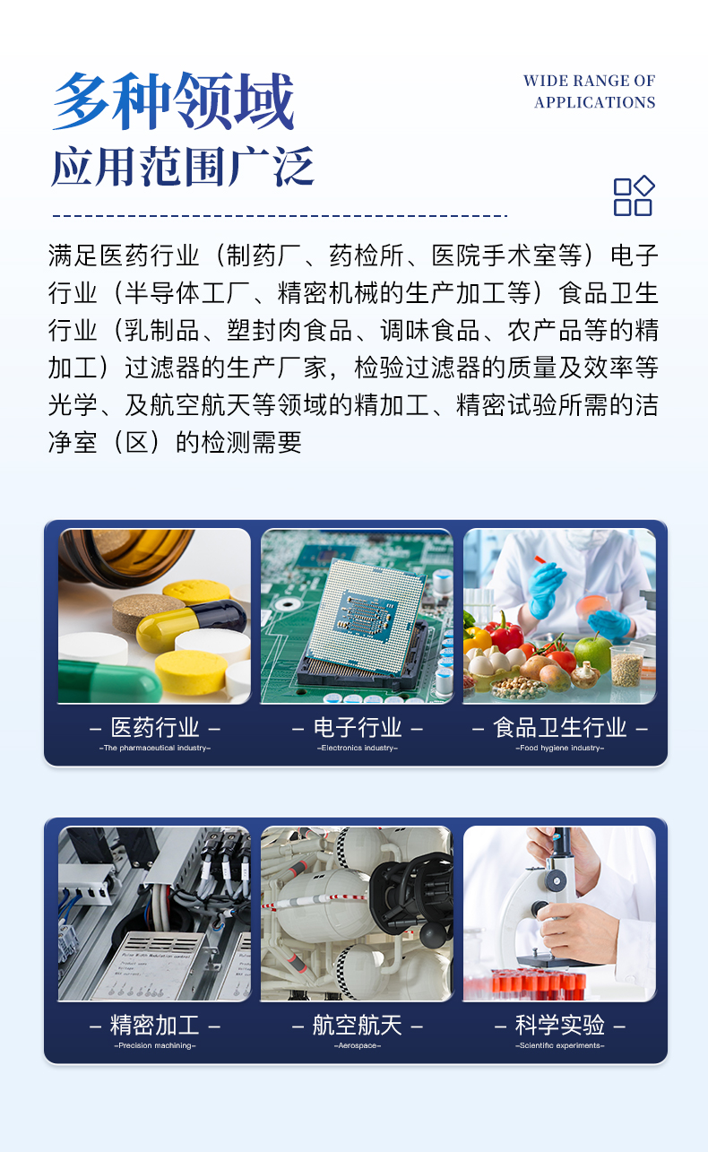 滿足醫(yī)藥行業(yè)(制藥廠、藥檢所、醫(yī)院手術(shù)室等);電子行業(yè)(半導(dǎo)體工廠、精密機(jī)械的生產(chǎn)加工等);食品衛(wèi)生行業(yè)(乳制品、塑封肉食品、調(diào)味食品、農(nóng)產(chǎn)品等的精加工);過濾器的生產(chǎn)廠家,檢驗(yàn)過濾器的質(zhì)量及效率等;光學(xué)、及航空航天等領(lǐng)域的精加工、精密試驗(yàn)所需的潔凈室(區(qū))的檢測需要。