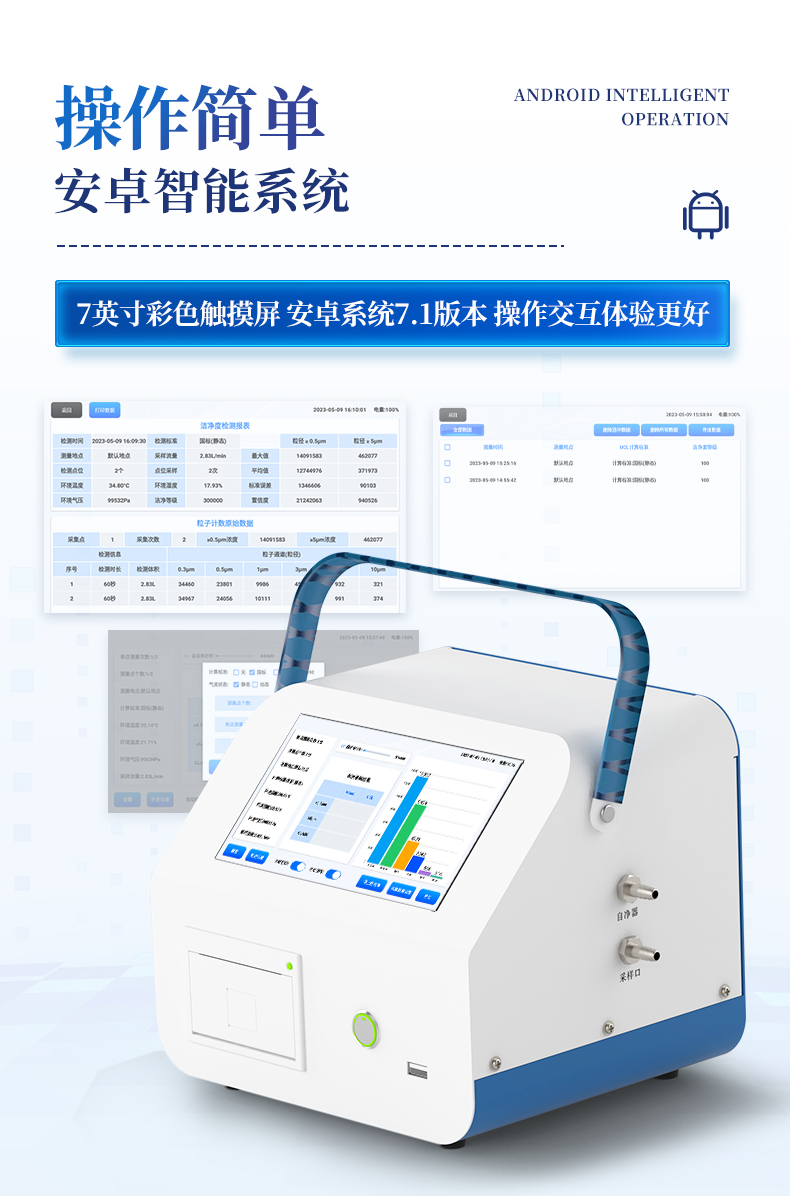 1、安卓系統(tǒng)7.1版本,操作交互體驗(yàn)更好。 2、內(nèi)置溫濕度傳感器、環(huán)境氣壓傳感器 3、核心部件光散射傳感器明顯消除腔體的雜散光,信噪比大為提高。從而使測量更準(zhǔn)確更可靠。 4、按95%置信度(UCL)計算,計數(shù)結(jié)果可換算成m3和ft3 5、依照凈化級別劃分和規(guī)定,自動判定凈化級別,使用便利。 6、帶審計追蹤功能,可查詢、可追溯、可控制,符合FDA 21CFR PART11規(guī)范 7、支持wifi、藍(lán)牙傳輸,數(shù)據(jù)可無線上傳;同時支持U盤拷貝數(shù)據(jù),免驅(qū)動插拔。 8、配置監(jiān)管平臺,檢測結(jié)果可直接無線傳至平臺,進(jìn)行潔凈度長短期分析,輔助管理。 9、內(nèi)置新一代高速熱敏打印機(jī),可選擇所需要打印的粒徑通道,靈活打印結(jié)果。 10、交直流兩用,內(nèi)置充電鋰電池,環(huán)保耐用可支持連續(xù)采樣6小時以上。 11、便捷簡易伸縮式云臺支架,安裝采樣操作更加方便。