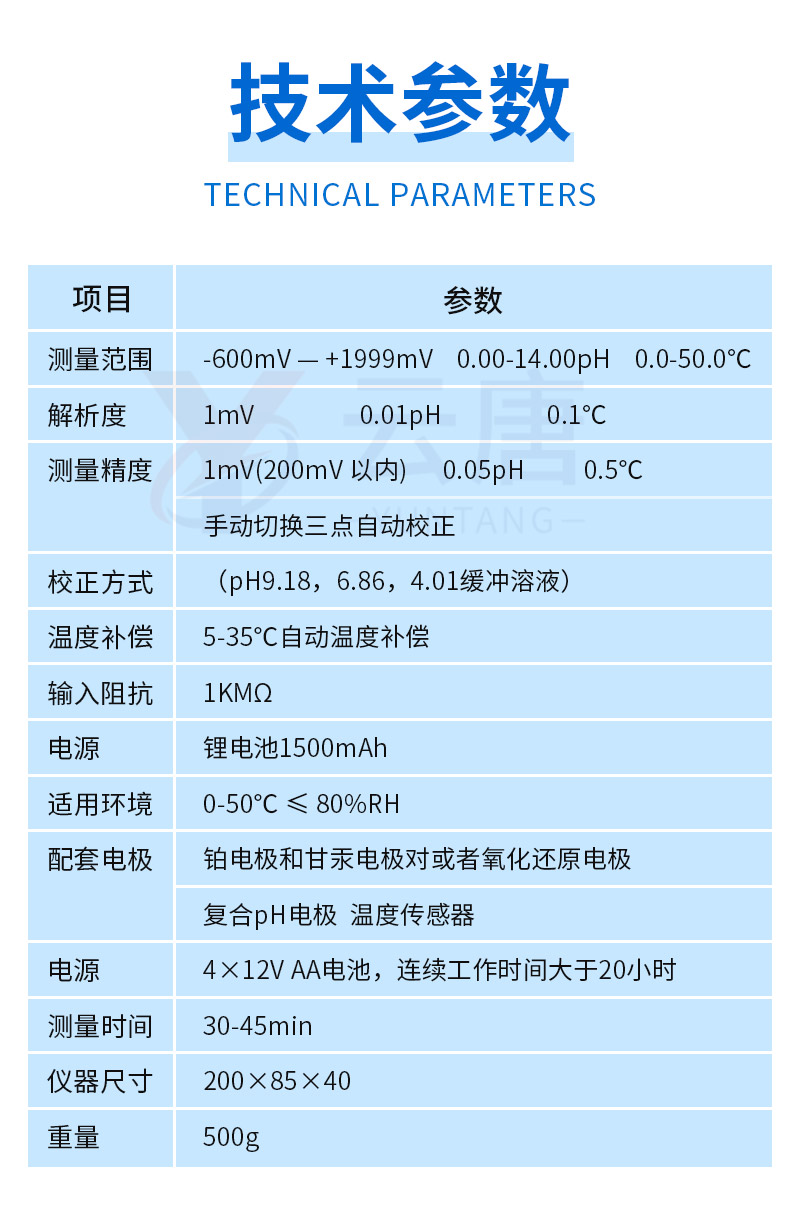 測量精度:1mV(200mV 以內(nèi)) 0.05pH 0.5℃