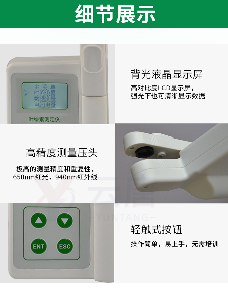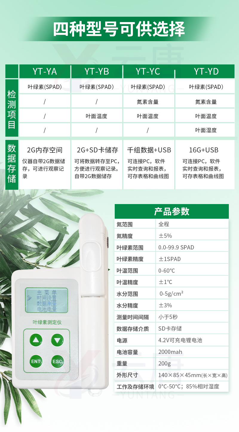 YT-YA植物葉綠素儀可以即時測量植物的葉綠素相對含量(單位SPAD)或“綠色程度”從而可以了解植物真實的硝基需求量并且?guī)椭私馔寥老趸娜狈Τ潭然蚴欠襁^多地施加了氮肥。您可以通過這種儀器來增加氮肥的利用率,并可保護環(huán)境(防止施加過多的氮肥而使環(huán)境特別是水源受到污染)。